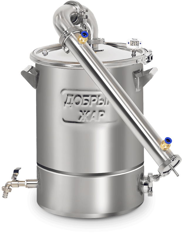 Электронный термометр установлен на крышке бака и в узле отбора, что позволяет контролировать температуру восходящих спиртовых паров.